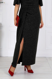 7509 Платье, которое само по себе становится событием. Роскошное вечернее платье из мерцающего трикотажа с нитью люрекс создано, чтобы подчеркнуть женственность и элегантность в каждом движении. Оно притягивает взгляд, играя бликами при любом освещении — будь то мягкий свет ресторанных ламп или огни праздничного зала. Это тот редкий случай, когда комфорт и эффектность соединяются в идеальном балансе: платье выглядит торжественно, но остаётся удобным даже во время самого долгого вечера. Главный акцент — отлетная деталь из того же мерцающего полотна. Она добавляет образу утончённую театральность. Съемный цвет выполнен в тон платья, его можно расположить на плече, в зоне декольте или у талии — в зависимости от настроения и события. Платье идеально садится по фигуре, подчёркивая достоинства женщин с роскошными формами. Эта модель — воплощение торжественности и женственности. Она будет уместна на свадьбе, юбилее, выпускном, театральной премьере или корпоративном вечере. Стоит лишь надеть туфли на каблуке и добавить каплю любимого парфюма — и вы уже героиня праздника, к которой прикованы все взгляды. Платье женское полуприлегающего силуэта, выполнено из трикотажного полотна с фактурной лицевой стороной «люрекс». Модель на трикотажной подкладке, с плечевыми накладками. В левом боковом шве обработана застежка на потайную тесьму-«молнию» (35 см). Перед платья с горизонтальным подрезом по линии талии и отлетной деталью в шве подреза. В правой части переда обработан рельеф с разрезом в нижней части. Вдоль рельефного шва заложены односторонние складки, направленные к центру переда. Спинка с талиевыми вытачками. Горловина спинки округлая, по переду V-образная, углубленная. Рукав короткий, втачной, формы «крылышко на запах», со скругленными краями. Платье дополнено съемным «цветком» из основного полотна. Длина платья - 136 см; длина рукава - 31 см.