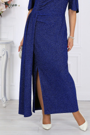 7509 Платье, которое само по себе становится событием. Роскошное вечернее платье из мерцающего трикотажа с нитью люрекс создано, чтобы подчеркнуть женственность и элегантность в каждом движении. Оно притягивает взгляд, играя бликами при любом освещении — будь то мягкий свет ресторанных ламп или огни праздничного зала. Это тот редкий случай, когда комфорт и эффектность соединяются в идеальном балансе: платье выглядит торжественно, но остаётся удобным даже во время самого долгого вечера. Главный акцент — отлетная деталь из того же мерцающего полотна. Она добавляет образу утончённую театральность. Съемный цвет выполнен в тон платья, его можно расположить на плече, в зоне декольте или у талии — в зависимости от настроения и события. Платье идеально садится по фигуре, подчёркивая достоинства женщин с роскошными формами. Эта модель — воплощение торжественности и женственности. Она будет уместна на свадьбе, юбилее, выпускном, театральной премьере или корпоративном вечере. Стоит лишь надеть туфли на каблуке и добавить каплю любимого парфюма — и вы уже героиня праздника, к которой прикованы все взгляды. Платье женское полуприлегающего силуэта, выполнено из трикотажного полотна с фактурной лицевой стороной «люрекс». Модель на трикотажной подкладке, с плечевыми накладками. В левом боковом шве обработана застежка на потайную тесьму-«молнию» (35 см). Перед платья с горизонтальным подрезом по линии талии и отлетной деталью в шве подреза. В правой части переда обработан рельеф с разрезом в нижней части. Вдоль рельефного шва заложены односторонние складки, направленные к центру переда. Спинка с талиевыми вытачками. Горловина спинки округлая, по переду V-образная, углубленная. Рукав короткий, втачной, формы «крылышко на запах», со скругленными краями. Платье дополнено съемным «цветком» из основного полотна. Длина платья - 136 см; длина рукава - 31 см.