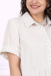 Лаконичное и стильное платье в духе сафари — идеальный баланс комфорта и элегантности на каждый день. Модель прямого силуэта с фигурной линией талии мягко садится по фигуре, не сковывая движения. Лиф выполнен из однотонной ткани с фактурой под лён, а воротник, планка, манжеты и низ — из контрастного материала в деликатную полоску, что добавляет образу глубину и характер. Отложной воротник со стойкой и аккуратная застёжка на пуговицы формируют сдержанный, деловой акцент. Короткий рукав с манжетой и отворотом, боковые карманы и лёгкая сборка по линии талии делают модель особенно удобной для повседневной носки. Натуральная ткань и хлопковая подкладка обеспечивают комфорт в течение всего дня. Платье легко адаптируется под разные ситуации: на работу, в офис, для деловых встреч или повседневных образов — всегда выглядит уместно и стильно. Белорусское качество, продуманный крой и универсальный дизайн делают эту модель отличным выбором для женщин с формами, ценящих комфорт и уверенность в каждом движении. Платье женское прямого силуэта, отрезное по линии талии. Лиф платья и рукава из ткани однотон, по структуре, напоминающей лён. Воротник, стойка, планки, манжеты рукава и низ платья из ткани компаньон в полоску, по структуре, напоминающей лён. Линия талии фигурная и со сборкой по верхнему срезу юбки. По центру полочки оформлена застежка с притачными планками до линии талии на 6 петель и 6 пуговиц. Рукав в платье втачной короткий, низ обработан притачной манжетой с «отворотом» и манжета декорирована пуговицей. Перед с нагрудными вытачками, направленными от пройм. Горловина оформлена отложным воротником со стойкой. В боковых швах платья, обработаны карманы. Низ платья на х/б подкладке. Длина платья –114 см (50-58 р-р); длина рукава-23,5 см.