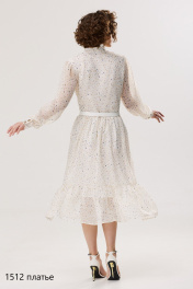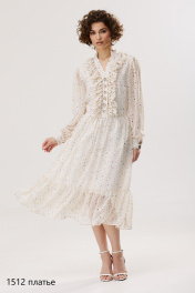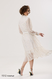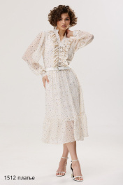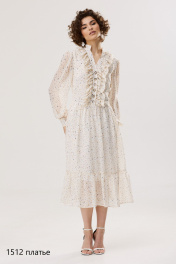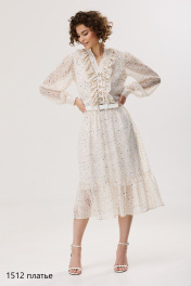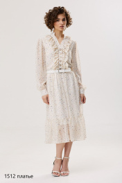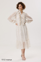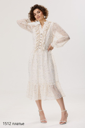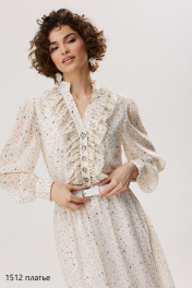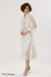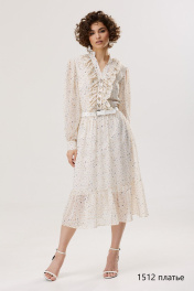 Платье приталенного силуэта на подкладке из итальянского шифона. Горловина V-образного выреза с застежкой на петли и пуговицы, с воротником стойкой. На застежке отделочные воланы к плечевому шву. По отрезной линии талии сборка,а в нижней части платья притачной волан. Рукав на манжете со сборкой по линии оката и низа.