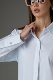 Блуза женская прямого силуэта, свободного кроя. Выполнена из блузочной ткани. Горловина оформлена воротником. Спинка и перед цельные. На переде расположена центрально-бортовая (потайная застежка) на петли и пуговицы. На стойке пришита декоративная пуговица. Низ блузы фигурный фантазийной формы. Ширина изделия на уровне глубины: 42р – 47см, 44р – 49см, 46р – 51см. Ширина по линии талии: 42р – 45см, 44р – 49см, 46р – 51см. Ширина по линии бедер: 42р – 49см, 44р – 51см, 46р – 53см. Длина по среднему шву спинки: 42-46 р - 51 см. Ширина плеча: 42р – 17см, 44р – 18см, 46р – 19см. Ширина рукава под проймой: 42-46р – 21 см. Длина рукава от горловины: 42-46р – 73 см.