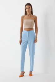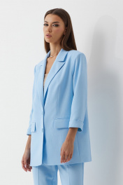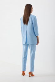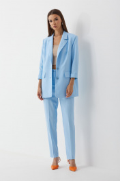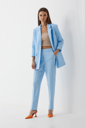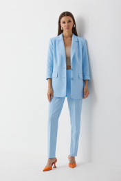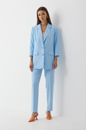 Комплект женский трехпредметный, состоящий из жакета, топа (бандо) и брюк. Жакет частично на подкладке, втачного покроя, с центрально-бортовой застежкой на две пуговицы. Горловина оформлена воротником пиджачного типа. Рукав ¾ двухшовны й с притачной манжетой по низу. Жакет состоит из переда, спинки и бочка. На переде расположены нагрудные вытачки и прорезные карманы в рамку с клапаном. По низу борта закругленные. Спинка со средним швом. Жакет оверсайз слегка прилегающего силуэта. Брюки классической формы, с заутюженными стрелками по задним и передним половинкам, заужены к низу, с боковыми наклонными карманами. Верхний срез обработан поясом со шлевками. Застежка на гульфик. На задних половинках расположены талиевые вытачки. Топ (бандо) выполнен из эластичного полотна полотна, двухсторонний, приталенного силуэта, без бретелей. Жакет: Ширина изделия на уровне глубины: 42р – 51см, 44р – 53см, 46р – 55см Ширина по линии талии: 42р – 50см, 44р – 52см, 46р – 54см Ширина по линии бедер: 42р – 53см, 44р – 55см, 46р – 57см Длина по среднему шву спинки: 74см Ширина спинки: 40см Ширина плеча: 13,5см Ширина рукава под проймой: 42р – 16,5см, 44р – 17,5см, 46р – 18,5см Длина рукава: 47см Топ: Ширина изделия на уровне глубины: 42р – 34см, 44р – 36см, 46р – 38см Ширина по линии талии: 42р – 31см, 44р – 32см, 46р – 33см Длина по среднему шву спинки: 20см Брюки: Ширина по линии талии (без натяжения резинки): 42р – 33см, 44р – 35см, 46р – 37см Ширина по линии бедер: 42р – 46см, 44р – 48см, 46р – 50см Длина по боковому шву: 100см Ширина брючины внизу: 42р – 16см, 44р – 17см, 46р – 18см Высота посадки: 33см Длина по внутреннему шву: 73см