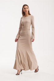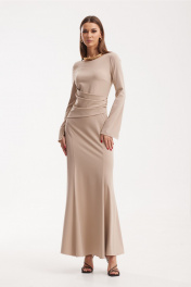 Платье женское приталенного силуэта, втачного покроя. Платье выполнено из трикотажного полотна моделирующего фигуру. Платье состоит из верхней, нижней и средней частей. Горловина ввиде «лодочки». Рукава длинные с разрезами в боковом шве. Платье «макси» от уровня колена расширяется к низу виде «годе». На спинке расположены вертикальные рельефы и средний шов с застежкой на «тесьму-молнию». По переду в верхней части расположены нагрудные выточки, рельефы, идущие из бокового шва на уровне бедер до низа. В области талии расположена отделочная деталь с драпировкой ассиметричной формы. Расклешение виде «годе» используется по всем вертикальным швам кроме среднего шва по спинке. Ширина изделия на уровне глубины: 42р – 40см, 44р – 42см, 46р – 44см; Ширина по линии талии: 42р – 32см, 44р – 34см, 46р – 36см; Ширина по линии бедер: 42р – 45см, 44р – 47см, 46р – 49см; Ширина рукава под проймой: 42р – 13см, 44р – 14см, 46р – 15см; Ширина плеча: 42-46р – 6,5см; Ширина спинки: 42-46р – 35,5см; Длина рукава: 42-46р – 64см; Длина по среднему шву спинки: 42-46р – 142см.