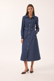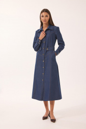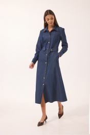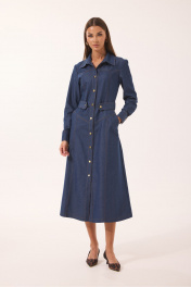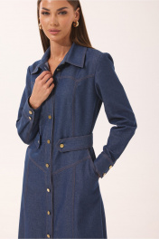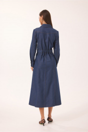 Платье женское полуприлегающего силуэта, втачного покроя, с центрально бортовой застежкой на планку на петли-пуговицы. Платье выполнено из джинсовой плательной ткани. Перед резной состоит из кокетки верхней, верхней центральной, верхней боковой частей, нижней кокетки переда, центральной нижней, боковой нижней частей. На переде так же расположены наклонные карманы, на талии хлястики, идущие от кулисы по спинке. Спинка состоит из кокетки, верхней части спинки, центральной и боковых частей. В центральной части по талии расположена кулиса с резинкой для лучшего прилегания. Рукав двушовный, полной длины, с манжетами по низу. Горловина оформлена стояче отложным воротником с отрезной стойкой. В модели используются отделочные строчки контрастного цвета, пуговицы так же являются отделкой и идут контрастного цвета. Ширина изделия на уровне глубины: 42р – 47см, 44р – 49см, 46р – 51см, 48р – 53см, 50р – 55см, 52р – 57см; Ширина по линии талии: 42р – 38см, 44р – 40см, 46р – 42см, 48р – 44см, 50р – 46см, 52р – 48см; Ширина по линии бедер: 42р – 55см, 44р – 57см, 46р – 59см, 48р – 61см, 50р – 63см, 52р – 65см; Ширина рукава под проймой: 42 – 17,5см, 44 – 18,5см, 46р – 19,5см, 48р – 19,5см, 50р – 20,5см, 52р – 21,5см; Ширина плеча: 42-46р – 12см, 48-52р – 12,5см; Ширина спинки: 42-46р – 38см, 48-52р – 41см; Длина рукава: 61см; Длина по среднему шву спинки: 42-46р – 120см, 48-52р – 121см.
