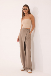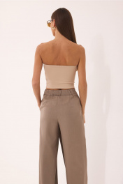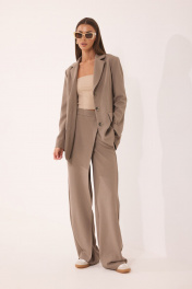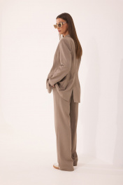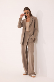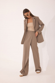 Комплект женский, состоит из жакета (на подкладке), топа-бандо и брюк. Жакет полуприлегающего силуэта с центрально-бортовой застежкой на петли пуговицы. Воротник пиджачного типа. Рукав длинный, втачной, двухшовный. По переду расположен подрез, переходящий в три вытачки (выделены отделочными строчками). В подрезе обработан карман с листочкой и клапанами, низ борта закруглен. Спинка состоит из двух частей, со шлицей по среднему шву и двумя талиевыми вытачками. Жакет на подкладке. Топ (бандо) выполнен из эластичного трикотажного полотна, двухсторонний, приталенного силуэта, без бретелей. Брюки свободной формы, спереди с запахом. Запах выполнен из правого бокового шва и пристегивается на петли-пуговицы на поясе. Возможно носить не застегивая, виде драпировки по правой боковой части. Верхний срез брюк обработан поясом, по спинке вставлена резинка. Застежка на молнию и в поясе – петля-пуговица. В боковых швах передних половинок расположены наклонные карманы. По передним половинкам и запахе – шлевки. Жакет: Ширина изделия на уровне глубины: 42р – 48см, 44р – 50см, 46р – 52см, 48р – 54см, 50р – 56см, 52р – 58см; Ширина по линии талии: 42р – 40см, 44р – 42см, 46р – 44см, 48р – 46см, 50р – 48см, 52р –50см; Ширина по линии бедер: 42р – 50см, 44р – 52см, 46р – 54см, 48р – 56см, 50р – 58см, 52р –60см; Длина по среднему шву спинки: 42-52р – 74см; Ширина плеча: 42-46р – 13см, 48р –52р – 14см; Ширина спинки: 42-46р – 40см, 48 –52 – 43см; Ширина рукава под проймой: 42р – 16,5см, 44р – 17,5см, 46р – 18,5см, 48р – 19,5см, 50р – 20,5см, 52р –21,5см; Длина рукава: 42-52р – 62см. Топ-бандо: Ширина изделия на уровне глубины: 42р – 33см, 44р – 34см, 46р – 36см, 48р – 38см, 50р – 40см, 52р – 42см; Ширина по линии низа: 42р – 30см, 44р – 32см, 46р – 34см, 48р – 36см, 50р – 38см, 52р – 40см; Длина по среднему шву спинки: 42-46р – 18см, 48-52р – 19см. Брюки: Ширина по линии талии: 42р – 32см, 44р – 34см, 46р – 36см, 48р – 38см, 50р – 40см, 52р – 42см; Ширина по линии бедер: 42р – 47см, 44р – 49см, 46р – 51см, 48р – 53см, 50р – 55см, 52р – 57см; Длина по боковому шву: 42-52р – 108см; Длина по внутреннему шву: 42-52р – 86см; Высота посадки: 42-46р – 34см, 48р –52р – 35см; Ширина внутри брючины: 42р – 28см, 44р – 30см, 46р – 32см, 48р – 34см, 50р – 36см, 52р – 38см.