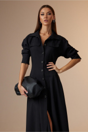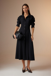 Платье женское полуприлегающего силуэта, длинное, покроя спущенное плечо с центральной бортовой застежкой на петли и пуговицы. Горловина оформлена стояче-отложным воротником с отрезной стойкой. По спинке и переду отрезная кокетка, в которую по переду вставлены клапаны. По спинке средний шов и рельефы. По спинке и переду подрезы круглой формы, в которые вставлены сильно расширенные клинья, которые создают красивые складки по низу изделия. Рукав одношовный, снизу с двумя складками и широкой манжетой, застегивающейся на две пуговицы. Ширина изделия на уровне глубины: 42р – 45см, 44р – 47см, 46р – 49см, 48р – 51см, 50р – 53см, 52р – 55 см; Ширина по линии талии: 42р – 36см, 44р – 38см, 46р – 40см, 48р – 42см, 50р – 44см, 52р – 46 см; Ширина рукава под проймой: 42-46р – 21см 48-52р – 23см; Ширина плеча: 42р – 17см, 44р – 18см, 46р – 19см, 48р – 19см, 50р – 20см, 52р – 21см; Длина рукава от плеча: 42-46р – 60см, 48-52р – 62см; Длина по среднему шву спинки: 42-46р – 124см, 48-52р – 125см.