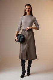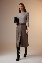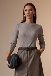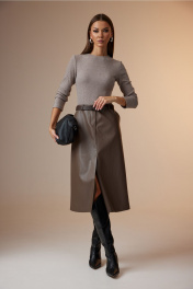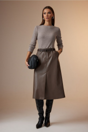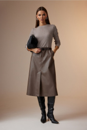 Платье женское полуприлегающего силуэта, выполнено из двух видов ткани: верх из трикотажного полотна виде джемпере, низ виде расширенной юбки из кожзаменителя. Джемпер с круглой горловиной, с втачными длинными рукавами и молнией по центру спинки. Юбка со средним швом на передней половинке, в котором шлица снизу и наклонные карманы. На заднем полотнище средний шов, в котором заканчивается молния и талиевые вытачки. На переднем и заднем полотнище пришиты шлевки. Ширина изделия на уровне глубины: 42р – 40см, 44р – 42см, 46р – 44см, 48р – 46см, 50р – 48см, 52р – 50см; Ширина по линии талии: 42р – 34см, 44р – 36см, 46р – 38см, 48р – 40см, 50р – 42см, 52р – 44см; Ширина по линии бедер: 42р – 47см, 44р – 49см, 46р – 51см, 48р – 53см, 50р – 55см, 52р – 57см; Ширина рукава под проймой: 42р – 15см, 44р – 16см, 46р – 17см, 48р – 18см, 50р – 19см, 52р – 20см; Ширина плеча: 42-46р – 10,5см, 48-52р – 12см; Ширина спинки: 42-46р – 31см, 48-52р – 33см; Длина рукава: 60см; Длина по среднему шву спинки: 113см.
