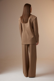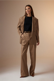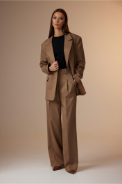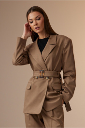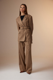 Комплект женский, состоящий из жакета и брюк, с поясом из основной ткани с декоративной пряжкой. Жакет свободной формы с расширенной линией плеча, на двубортную застежку. На жакете так же пришита третья пуговица, при застегивании на нее силуэт меняется на приталенный. Воротник пиджачного типа, борта внизу закругленные. Рукав длинный двухшовный. По переду отрезной бочок и прорезные карманы в рамку, с клапанами. На правой полочке сверху листочка с втачными концами. Спинка со средним швом и бочками. Брюки расширенного силуэта, со стрелками, с притачным поясом, застегивающимся на одну пуговицу. На поясе расположены шлевки. Застежка брюк с гульфиком на "тесьму-молнию". Брюки с наклонными карманами к боковому шву. Передняя половина брюк с одной направленной складкой. На задних половинах брюк расположены талевые вытачки. Жакет: Ширина изделия на уровне глубины: 42р – 51см, 44р – 53см, 46р – 55см, 48р – 55см, 50р – 57см, 52р – 59см; Ширина по линии талии: 42р – 49см, 44р – 51см, 46р – 53см, 48р – 53см, 50р – 55см, 52р –57см; Ширина по линии бедер: 42р – 52см, 44р – 54см, 46р – 56см, 48р – 56см, 50р – 58см, 52р –60см; Длина по среднему шву спинки: 42-46р – 72см, 48-52р – 73см; Ширина рукава под проймой: 42р – 38см, 44р – 39см, 46р – 40см, 48р – 40см, 50р – 41см, 52р –42см; Длина рукава: 62см; Ширина плеча: 42-46р – 17см, 48-52р – 18см; Ширина спинки: 42-46р – 40см, 48-52р –42см; Длина ремня, пояса: 42-46р – 130см, 48-52р – 142см; Ширина ремня: 4,5см. Брюки: Ширина по линии талии: 42р – 34см, 44р – 36см, 46р – 38см, 48р – 40см, 50р – 42см, 52р – 44см; Ширина по линии бедер: 42р – 51см, 44р – 53см, 46р – 55см, 48р – 57см, 50р – 59см, 52р – 61см; Длина по боковому шву: 42р – 112см, 44р – 112см, 46р – 112см, 48р – 112см, 50р – 112см, 52р – 112см; Ширина брючины внизу: 42р – 27см, 44р – 28см, 46р – 29см, 48р – 30см, 50р – 31см, 52р – 31см; Высота посадки: 42-46р – 36см, 48-52р – 38см; Длина по внутреннему шву: 42-46р – 82см, 48-52р –81см.