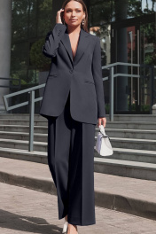 Элегантный жакет, слегка приталенного силуэта с острыми лацканами, застежкой на пуговицу и закругленными бортами. Прорезные карманы "в рамку" и имитированный карман с листочкой в верней части. Жакет на подкладке из 100% п/э, по спинке средний шов и талиевые вытачки. Рукава втачные двухшовные, внизу с обработанными шлицами на три пуговицы. Брюки-палаццо, со стрелками, на поясе с застежкой на пуговицу и тесьму-молнию. По бокам обработаны карманы. Длина жакета- 75см, длина рукава- 63см, длина брюк- 106см