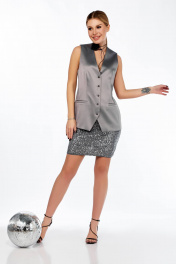 Нарядная удлиненная жилетка из атласной ткани, с поясом в комплекте. Полуприлегающего силуэта, на подкладке, по переду рельефные швы и карманы с листочками. Вырез горловины V-образный, застежка на петли и пуговицы. Спинка со средним швом и рельефными швами. Длина жилетки 84см