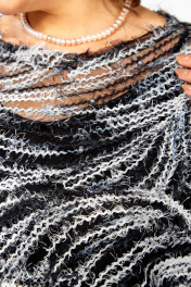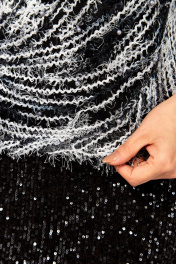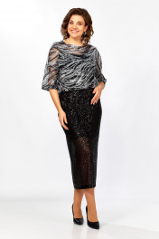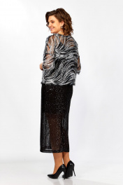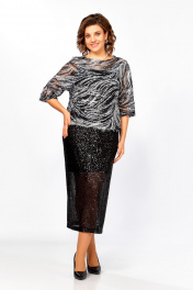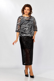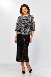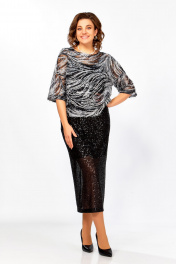 Шикарный комплект, сочетающий две фактуры. Блузка нарядная прямого силуэта, из интересной ткани с бусинами. Вырез горловины округлой формы, со спущеныным рукавом длиной 3/4. Юбка длиной миди на поясе (резинка по бокам) из отделочной атласной ткани. По спинке средний шов, в который вставлена потайная молния и заканчивающийся разрезом длиной выше колена. Юбка на подкладке. Топ на бретелях.