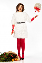 Платье нарядное прямого силуэта, из интересной ткани с бахромой, с округлым вырезом горловины и спущенной линией плеча. Рукав длиной до локтя. Длина платья 92см, длина рукава от горловины 41,5см