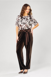 Комплект повседневный из бархатного полотна.Брюки заужены к низу, на поясе. Пояс на резинке, слева завязка из отделочной ткани. Карманы в боковых швах. Блузка с округлям вырезом горловины, со спущенным коротким рукавом. длина брюк 103см. 54 56 58 брюки пояс 84/100 90/106 94/110 ОБ 117 121 125 длина 103 103 103 блузка ОГ 116 120 124