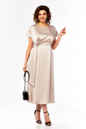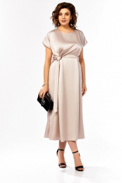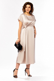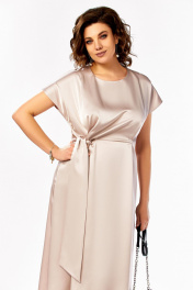 Платье женское, полуприлегающего силуэта со спущенным рукавом. Отрезное по линии талии, по переду заложены складки. С правой стороны в области талии вставлен пояс из основной ткани. Спинка со средним швом и потайной молнией.