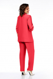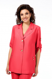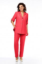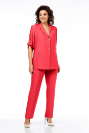 Жакет полуприлегающего силуэта, с пиджачным воротником, застежка на две пуговицы. На полочке шлицы с декоративными шлицами. Спинка со средним швом. Рукав втачной, длиной три четверти, регулируется патой. Брюки прямые, пояс на резинке, карманы в боковых швах. Длина жакета 70см, длина рукава 47см. Длина брюк 109см