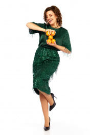 Нарядное платье, полуприлегающего силуэта. Вырез горловины округлой формы спереди, по спинке V-образной формы. Отрезное по линии талии, на резинке. Верхняя часть из струящейся ткани, а низ из ткани в паетки. Рукав короткий с отрезной деталью из ткани в паетки. В левом боковом шве молния. Длина платья от плеча 116см, длна рукава 34,5см