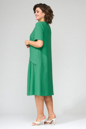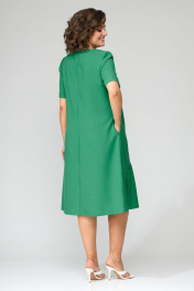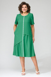 Платье А-образного силуэта, втачного покроя. Спинка в платье со средним швом, расширенная к низу по боковым срезам. Перед ассиметричной формы с наклонными подрезами в которых расположены сборка и декоративные планки из основной ткани. На переде расположены нагрудные вытачки, идущие из боковых швов. В боковых швах расположены карманы. Горловина округлой формы. Рукава короткие, одношовные с цельнокроенной манжетой. По центральному шву переда настрочена декоративная тесьма. Ширина изделия на уровне глубины: 52р – 54,5см, 54р – 56,5см, 56р – 58,5см Ширина по линии талии: 52р – 53,5см, 54р – 55,5см, 56р – 57,5см Ширина по линии бедер: 52р – 63см, 54р – 65см, 56р – 67см Длина платья по среднему шву спинки: 108см Ширина спинки: 41см Ширина плеча: 9,5см Ширина рукава под проймой: 52р – 19,5см, 54р – 20,5см, 56р – 21,5см Длина рукава: 27см