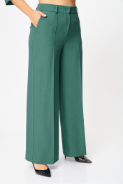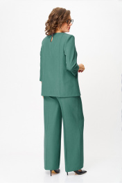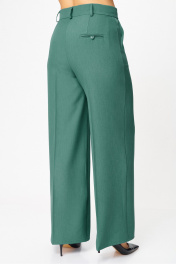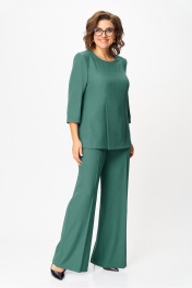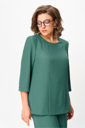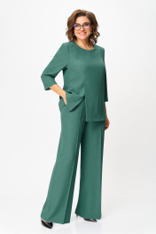 "Комплект женский, состоящий из блузы и брюк. Блуза прямого силуэта, с рельефами из плечевого шва. На правой части переда рельеф переходит в отлетную шлицу. Рукав – ¾, двухшовный, втачной. Горловина округлой формы, по спинке с вырезом в форме «капельки», оформлена обтачкой. По спинке вертикальные рельефы с отделочной строчкой. Брюки прямые, свободные. Верхний срез оформлен поясом, застегивающимся на петлю-пуговицу. На поясе шлевки, застежка с гульфиком на тесьму-молнию. В боковых швах выполнены наклонные карманы. На задней правой половинке брюк выполнен прорезной карман в рамку с петелькой и пуговицей отделочной (карман не функциональный). Блуза: Ширина изделия на уровне глубины: 48р – 51см, 50р – 53см, 52р – 55см, 54р – 57см, 56р – 59см, 58р – 61см; Ширина по линии бедер: 48р – 55см, 50р – 57см, 52р – 59см, 54р – 61см, 56р – 63см, 58р – 65см; Длина по среднему шву спинки: 48-52р – 67см, 54-58р – 69см; Ширина спинки: 48-52р – 41см, 54-58р – 43см; Ширина плеча: 48-52р – 10,5см, 54-58р – 12см; Ширина рукава под проймой: 48р – 19см, 50р – 20см, 52р – 21см, 54р – 22см, 56р – 23см, 58р – 24см; Длина рукава: 48-58р – 48см. Брюки: Ширина по линии талии (без натяжения резинки): 48р – 39см, 50р – 41см, 52р – 43см, 54р – 45см, 56р – 47см, 58р – 49см; Ширина по линии бедер: 48р –53см, 50р – 55см, 52р – 57см, 54р – 59см, 56р – 61см, 58р – 63см; Длина по боковому шву с поясом: 48-58р – 107см; Ширина брючины внизу: 48р –33см, 50р – 34см, 52р – 35см, 54р – 35см, 56р – 36см, 58р – 37см; Высота посадки: 48р-52р – 33см, 54-58р – 34см; Длина по внутреннему шву:48р-52р – 81см, 54-58р – 80см"