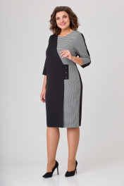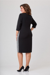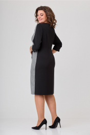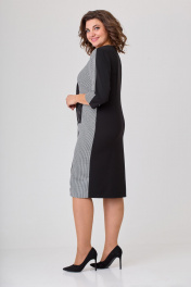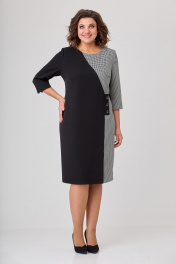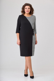 Платье женское полуприлегающего силуэта, втачного покроя. Платье выполнено из двух видов ткани: однотонной (плательно-костюмной группы) и черно-белой отделочной. Горловина в платье округлой формы. Рукава двушовные с разрезом по локтевому шву. Длина рукава ¾. Левый рукав с центральным швом в верхней части рукава. Верхняя центральная часть рукава выполнена из отделочной ткани в поддержку левой боковой части переда, правая часть переда выполнена из однотонной плательной ткани. Шов, соединяющий эти части переходит в имитацию застежки на три пуговицы и далее переходит в шлицу. Спинка цельная с вертикальными талиевыми вытачками. На рукаве над разрезами пришиты декоративные пуговицы. Ширина изделия на уровне глубины: 52р – 55см, 54р – 57см, 56р – 59см; Ширина по линии талии: 52р – 51см, 54р – 53см, 56р – 55см; Ширина по линии бедер: 52р – 58,5см, 54р – 60,5см, 56р – 62,5см; Длина по среднему шву спинки: 52-56р – 104см; Ширина спинки: 52-56р – 43,5см; Ширина плеча: 52-56р – 9см; Ширина рукава под проймой: 52р – 20см, 54р – 21см, 56р – 22см; Длина рукава: 52-56р – 45см.