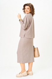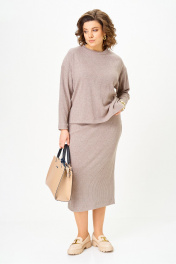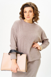 Комплект женский состоит из джемпера и юбки, выполнен из трикотажного полотна. Джемпер свободной формы, покроя спущенное плечо, по боковым швам с разрезами. Горловина округлой формы, обработана бейкой из основной ткани. Рукав одношовный, полной длины, зауженный книзу. Юбка прямого силуэта, на трикотажной подкладке. Верхний срез с цельнокроеной обтачкой на резинке. Джемпер: Ширина изделия на уровне глубины: 48р – 56см, 50р – 58см, 52р – 60см, 54р – 60см; Ширина по линии бедер: 48р – 57см, 50р – 59см, 52р – 61см, 54р – 61см; Длина по среднему шву спинки: 60см, Ширина плеча: 48р – 18см, 50р – 19см, 52р – 20см, 54р – 21см; Ширина рукава под проймой: 22см Длина рукава: 48см. Юбка: Ширина по линии талии (без натяжения резинки): 48р – 34см, 50р – 36см, 52р – 38см, 54р – 38см; Ширина по линии бедер: 48р –51см, 50р – 53см, 52р – 55см, 54р – 57см; Длина по боковому шву: 76см.