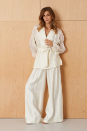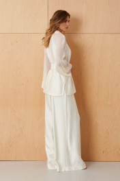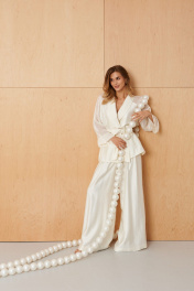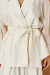 Этот женский жакет выполнен из струящейся мягкой ткани, идеально подходящей для торжественных случаев. Модель выполнена в молочном оттенке и обладает элегантным и аккуратным фасоном. Центральная бортовая застежка с обметанными петлями и пуговицами придает жакету строгий и изящный внешний вид. Передняя часть украшена двумя рельефами, которые начинаются от пройм и тянутся до линии низа, создавая интересные линий и объемность силуэта. В боковых швах расположены небольшие разрезы, обеспечивающие свободу движений и повышая комфорт при ношении. В этих же швах вставлены шлевки, предназначенные для закрепления пояса или использования в декоративных целях. Воротник-шаль мягко обрамляет горловину, придавая образу нежность и изящность. Рукава выполнены по модели реглан из прозрачной ткани, что добавляет легкости, романтичности и воздушности образу. Жакет комплектуется поясом из основной ткани, который подчеркивает талию и создаёт женственный силуэт. Этот наряд идеально подойдет для особых мероприятий, подчеркивая элегантность и изысканность обладательницы. 46 Жакет: Длина изделия по спинке - 72см, Длина рукава с плечом - 68см, Ширина по бедрам - 62см, Ширина по груди - 56см, Ширина по талии - 58см, Ширина рукава - 24см; 50 Жакет: Длина изделия по спинке - 72см, Длина рукава с плечом - 68см, Ширина по бедрам - 66см, Ширина по груди - 60см, Ширина по талии - 62см, Ширина рукава - 26см;