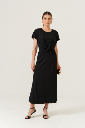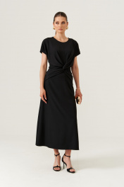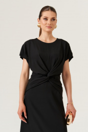 Это женское платье из поливискозной ткани, подходящее как для повседневной носки, так и для торжественных мероприятий. Модель отрезная по линии талии и выполнена в полуприлегающем силуэте, что обеспечивает комфортную посадку и элегантный силуэт. Лиф переда украшен средним швом и декоративным узлом в виде перекрута, добавляющим изящности. Спинка оснащена двумя талиевыми вытачками и средним швом, в среднем шве расположена потайная застёжка-молния для удобства надевания. Горловина круглая, рукава цельнокроеные, что создает гладкий и аккуратный вид. Платье выполнено на вискозной подкладке, что обеспечивает комфорт и хорошую посадку. Длина изделия — макси, платье чёрного цвета — это классический выбор для различных случаев. 44 Платье: Длина изделия по спинке - 130см, Ширина по бедрам - 52см, Ширина по груди - 46см, Ширина по талии - 40см; Подкладка: Ширина плеча - 25.5см; 46 Платье: Длина изделия по спинке - 130см, Ширина по бедрам - 54см, Ширина по груди - 48см, Ширина по талии - 42см; Подкладка: Ширина плеча - 26см; 48 Платье: Длина изделия по спинке - 130см, Ширина по бедрам - 56см, Ширина по груди - 50см, Ширина по талии - 44см; Подкладка: Ширина плеча - 26.5см; 50 Платье: ; Подкладка: ; 52 Платье: ; Подкладка: ; 54 Платье: ; Подкладка: ;