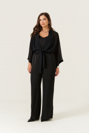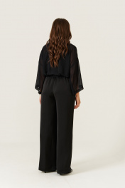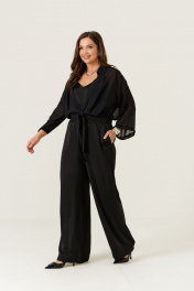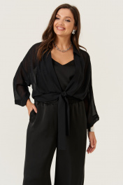 Эта женская блузка выполнена из легкой и мягкой струящейся ткани, идеально подходящей для повседневных образов. Модель обладает прямым силуэтом, обеспечивающим комфорт и стильный внешний вид. Цвет — классический черный, что делает блузку универсальной и легко сочетаемой с различными вещами. Край борта обработан планкой, а перед украшен декоративными стразами, придающими изделию изящность и немного нарядности. Передняя часть оформлена складками, что добавляет объем и интересный визуальный эффект. Низ изделия обработан притачным поясом, который завязывается для дополнительной фиксации и акцента на талии. Горловина выполнена в рубашечном стиле с отрезной стойкой, создавая аккуратный и классический силуэт. Рукава втачные, длинные, украшены декоративными стразами. Линия плеча спущена, что придает рукавам свободный и комфортный крой. Эта блузка станет отличным выбором для повседневных прогулок или неформальных встреч, добавляя вашему стилю нотки утонченности и современности. 46 Блузка: Длина изделия по спинке - 48см, Длина рукава - 33см, Ширина плеча - 26см, Ширина по груди - 57см, Ширина рукава вверху - 22см, Ширина рукава внизу - 23,5см; 48 Блузка: Длина изделия по спинке - 48см, Длина рукава - 33см, Ширина плеча - 26,5см, Ширина по груди - 59см, Ширина рукава вверху - 22,5см, Ширина рукава внизу - 24см; 50 Блузка: Длина изделия по спинке - 48см, Длина рукава - 33см, Ширина плеча - 27см, Ширина по груди - 61см, Ширина рукава вверху - 23см, Ширина рукава внизу - 24,5см; 52 Блузка: Длина изделия по спинке - 49см, Длина рукава - 33см, Ширина плеча - 28см, Ширина по груди - 63см, Ширина рукава вверху - 23,5см, Ширина рукава внизу - 25см; 54 Блузка: Длина изделия по спинке - 49,5см, Длина рукава - 33см, Ширина плеча - 28см, Ширина по груди - 65см, Ширина рукава вверху - 24,5см, Ширина рукава внизу - 25,5см; 56 Блузка: Длина изделия по спинке - 50см, Длина рукава - 33см, Ширина плеча - 28,5см, Ширина по груди - 67см, Ширина рукава вверху - 25,5см, Ширина рукава внизу - 26см;