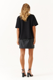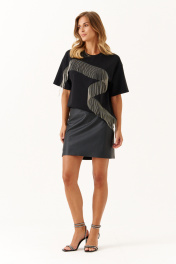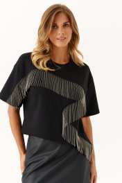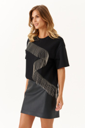 Это женский джемпер, выполненный из мягкого трикотажного полотна, идеально подходящего для повседневной носки. Модель отличается комфортной посадкой и стильным дизайном. Горловина чуть расширенная, что создает приятное ощущение свободы и легкости при ношении. Перед с фигурным швом, в который вставлена тесьма с цепью, которая переходит на рукав. Данный декор добавляет образу расслабленности и современного стиля. Линия плеча немного опущена. Рукава втачные длиной до уровня локтя. Этот джемпер чёрного цвета отлично подойдет для повседневных образов, сочетая уют и стиль. 42 Джемпер: ; 44 Джемпер: Длина изделия по спинке - 59см, Длина рукава - 19.5см, Ширина по груди - 54см, Ширина по низу - 52см, Ширина рукава - 19.5см; 46 Джемпер: Длина изделия по спинке - 59см, Длина рукава - 19.8см, Ширина по груди - 56см, Ширина по низу - 54см, Ширина рукава - 20см; 48 Джемпер: Длина изделия по спинке - 59см, Длина рукава - 20см, Ширина по груди - 58см, Ширина по низу - 56см, Ширина рукава - 21см; 50 Джемпер: Длина изделия по спинке - 59см, Длина рукава - 20.2см, Ширина по груди - 60см, Ширина по низу - 58см, Ширина рукава - 21.5см;