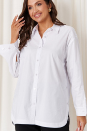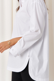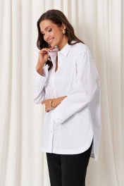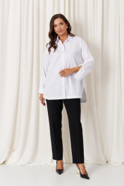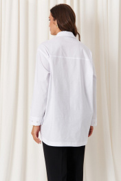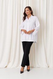 Эта женская блузка выполнена из качественной смесовой ткани с высоким содержанием хлопка, что обеспечивает комфорт и приятное ощущение на теле. Она обладает классическим прямым силуэтом, идеально подходящим для повседневной и деловой одежды. Блузка оснащена центральной бортовой застежкой на пуговицах, что облегчает надевание. Спинка украшена кокеткой, добавляющей изысканности и аккуратности силуэту, а боковые швы дополнены имитацией планки с декоративными пуговицами, придающими образу стильный акцент. Горловина оформлена классическим рубашечным воротником, создающим аккуратный и строгий вид. Линия плеча спущена, что добавляет свободного и непринужденного стиля. Рукава втачные, с низом, обработанным притачной манжетой. Низ рукавов также украшен двумя застежками, что дополнительно подчеркивает детализацию изделия. Особенностью дизайна является асимметричный крой: передний край блузки выполнен полукруглым и чуть короче спинки, создавая стильный и современный силуэт. Цвет блузки – белый, что делает её универсальной и легко сочетаемой с различными нарядами. Эта блузка станет отличным дополнением гардероба, сочетая комфорт с элегантностью и классикой. 50 Блузка: Длина изделия по спинке - 78см, Длина рукава - 53см, Ширина плеча - 19см, Ширина по бедрам - 63см, Ширина по груди - 63см, Ширина рукава - 63см; 52 Блузка: Длина изделия по спинке - 78см, Длина рукава - 53см, Ширина плеча - 19.4см, Ширина по бедрам - 65см, Ширина по груди - 65см, Ширина рукава - 65см; 54 Блузка: Длина изделия по спинке - 78см, Длина рукава - 53см, Ширина плеча - 19.8см, Ширина по бедрам - 67см, Ширина по груди - 67см, Ширина рукава - 67см; 56 Блузка: Длина изделия по спинке - 78см, Длина рукава - 53см, Ширина плеча - 20.2см, Ширина по бедрам - 69см, Ширина по груди - 69см, Ширина рукава - 69см; 58 Блузка: Длина изделия по спинке - 78.5см, Длина рукава - 53см, Ширина плеча - 20.5см, Ширина по бедрам - 71см, Ширина по груди - 71см, Ширина рукава - 71см; 62 Блузка: Длина изделия по спинке - 78.5см, Длина рукава - 53см, Ширина плеча - 21.2см, Ширина по бедрам - 75см, Ширина по груди - 75см, Ширина рукава - 75см;