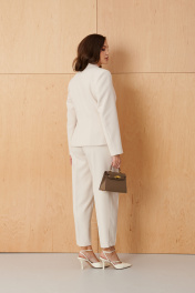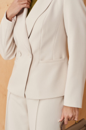 Женский жакет из поливискозной ткани в бежевом оттенке отлично подойдет для повседневной носки. Его полуприлегающий силуэт обеспечивает комфорт и стиль, а крою характерны криволинейная линия борта и аккуратная обработка. Передняя часть украшена рельефами и двумя карманами с листочкой, что дополнительно подчеркивает элегантность изделия. Застежка двубортная на обметанные петли и пуговицы придает жакету классический вид, в то время как воротник пиджачного типа добавляет изысканности. Спинка выполнена с средним швом и двумя вертикальными рельефами, идущими от плечевого шва до линии низа, что создает стройный силуэт. Длинные втачные рукава и отделочные строчки по воротнику и краю борта завершают дизайн, делая жакет стильным и аккуратным. 44 Жакет: Длина изделия - 61см, Длина рукава - 62см, Ширина плеча - 12.3см, Ширина по груди - 46см, Ширина по низу - 53см, Ширина рукава - 18.5см; 46 Жакет: Длина изделия - 61см, Длина рукава - 62см, Ширина плеча - 12.5см, Ширина по груди - 48см, Ширина по низу - 55см, Ширина рукава - 19см; 48 Жакет: Длина изделия - 61.5см, Длина рукава - 62см, Ширина плеча - 12.5см, Ширина по груди - 50см, Ширина по низу - 57см, Ширина рукава - 19.8см;