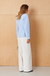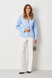 Женский жакет из смесовой ткани с высоким содержанием хлопка в голубом оттенке обладает элегантным и утонченным дизайном. Вырез горловины V-образной формы. Рукава втачные, длинные. Центральная бортовая застежка на одну кнопку с оригинальной кнопкой в виде ракушки создает акцент и добавляет изюминку образу. Передняя часть украшена двумя рельефами: один идет от плечевого шва до низа, другой — от проймы до линии низа, что подчеркивает стройность силуэта. Спинка выполнена с средним швом и двумя вертикальными рельефами, идущими от плечевого шва до низа, что создает структуру и объем. Жакет выполнен на подкладке для комфортной носки изделия и аккуратного вида. Этот жакет прекрасно подойдет для тех, кто ценит стиль и комфорт, сочетая в себе классические детали и современные акценты. 44 Жакет: Длина изделия по спинке - 60см, Длина рукава - 62см, Ширина плеча - 13.5см, Ширина по груди - 48см, Ширина по низу - 53см, Ширина по талии - 41см, Ширина рукава вверху - 21.5см, Ширина рукава внизу - 13см; 46 Жакет: Длина изделия по спинке - 60см, Длина рукава - 62.3см, Ширина плеча - 13.6см, Ширина по груди - 50см, Ширина по низу - 55см, Ширина по талии - 43см, Ширина рукава вверху - 22.3см, Ширина рукава внизу - 13.3см; 48 Жакет: Длина изделия по спинке - 60см, Длина рукава - 62.5см, Ширина плеча - 13.7см, Ширина по груди - 52см, Ширина по низу - 57см, Ширина по талии - 45см, Ширина рукава вверху - 23см, Ширина рукава внизу - 13.8см; 50 Жакет: Длина изделия по спинке - 60см, Длина рукава - 62.5см, Ширина плеча - 13.8см, Ширина по груди - 54см, Ширина по низу - 59см, Ширина по талии - 47см, Ширина рукава вверху - 24см, Ширина рукава внизу - 14см;