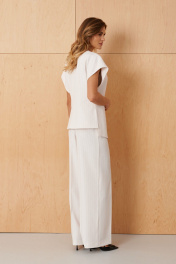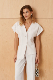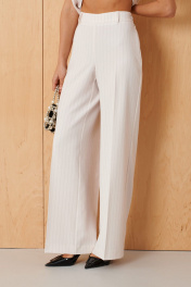 Это женские брюки из легкой и струящейся ткани, выполненные в мягкой молочной палитре с тонкой легкой полоской, что придает им изысканный и утонченный внешний вид. Классический прямой крой обеспечивает комфорт и универсальность, позволяя комфортно чувствовать себя в повседневных и деловых образах. Верхний срез брюк обработан притачным поясом, который дополнен застежкой на одну обметанную петлю с пуговицей и молнией в боковом шве, что обеспечивает надежную и удобную посадку. В задней части расположены две талиевые вытачки, которые помогают точно моделировать силуэт, создавая аккуратную посадку и подчеркивая линию талии. Эти стильные брюки отлично сочетаются с различными топами и блузками, их можно носить как в деловой обстановке, так и в повседневных ситуациях, благодаря универсальному дизайну и нейтральной палитре. Они идеально подходят для офисных встреч, деловых мероприятий или ежедневных прогулок, сочетаясь с разными стилями и создавая эффектный и в то же время комфортный образ. 44 Брюки: Высота посадки - 27см, Длина брюк без пояса - 105см, Длина по внутреннему шву - 84см, Ширина брючин сверху - 67см, Обхват брюк по низу - 61см, Ширина по бедрам - 49,5см, Ширина по талии - 38,5см; 46 Брюки: Высота посадки - 27,5см, Длина брюк без пояса - 105см, Длина по внутреннему шву - 84см, Ширина брючин сверху - 69см, Обхват брюк по низу - 62,5см, Ширина по бедрам - 51,5см, Ширина по талии - 40,5см; 48 Брюки: Высота посадки - 28см, Длина брюк без пояса - 105,5см, Длина по внутреннему шву - 84см, Ширина брючин сверху - 71,5см, Обхват брюк по низу - 64см, Ширина по бедрам - 53,5см, Ширина по талии - 42,5см; 50 Брюки: Высота посадки - 28см, Длина брюк без пояса - 105,5см, Длина по внутреннему шву - 84см, Ширина брючин сверху - 74см, Обхват брюк по низу - 65,5см, Ширина по бедрам - 55,5см, Ширина по талии - 45см; 52 Брюки: Высота посадки - 28,3см, Длина брюк без пояса - 105,5см, Длина по внутреннему шву - 84см, Ширина брючин сверху - 76см, Обхват брюк по низу - 67см, Ширина по бедрам - 57,5см, Ширина по талии - 47,5см;