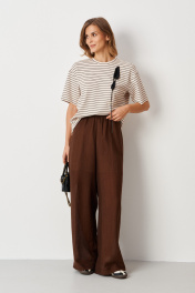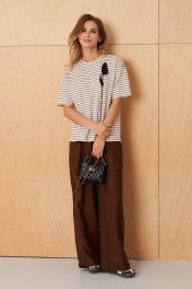 Женский джемпер из поливискозного трикотажного полотна с изящным полосатым рисунком. Модель выполнена в прямом силуэте, что обеспечивает универсальность и легкость в сочетании с различными вещами. Передняя часть украшена декоративным элементом с блестящим шнуром в форме стебля, что придает образу яркий и оригинальный акцент. Горловина обработана окантовочной тесьмой, что подчеркивает аккуратность и завершенность дизайна. Линия плеча спущена, что создает более расслабленное и свободное ощущение при ношении, а рукава втачные длиной чуть ниже локтя делают модель особенно комфортной и актуальной. Молочный оттенок джемпера делает его универсальным и легким для сочетания с разными цветами и стилями. Такой джемпер отлично подойдет для повседневного образа, добавив нотки элегантности и уютности. 44 Джемпер: Длина изделия по спинке - 60см, Длина рукава - 20.5см, Ширина по груди - 52см, Ширина по низу - 52см, Ширина рукава - 19.5см; 46 Джемпер: Длина изделия по спинке - 60см, Длина рукава - 20.5см, Ширина по груди - 54см, Ширина по низу - 54см, Ширина рукава - 20см; 48 Джемпер: Длина изделия по спинке - 60.5см, Длина рукава - 21см, Ширина по груди - 56см, Ширина по низу - 56см, Ширина рукава - 20.5см; 52 Джемпер: Длина изделия по спинке - 61см, Длина рукава - 21.5см, Ширина по груди - 60см, Ширина по низу - 60см, Ширина рукава - 22см;