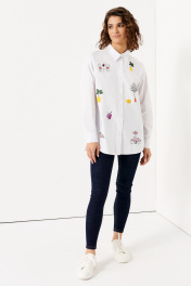 Блузка на пуговицах – удачное решение для создания элегантных образов. Модель, украшенная необычными яркими принтами, станет акцентом ваших сетов в комбинациях с брюками, юбками, джинсами, обувью на каблуке или спортивного типа. Блузка с длинным рукавом, который оканчивается застегивающимися манжетами, доступна в размерах 42-50. Ее индивидуальность подчеркивает рубашечный отложной воротник. Фасон изделия прямой, низ – фигурный, округлый. Удлиненная блуза пошита из приятной на ощупь хлопковой ткани. Нити полиэстера и эластана придают ей прочность. Купите нарядную блузку для деловой встречи, торжественного мероприятия, корпоратива, дружеской встречи. Благодаря ей будете выглядеть безупречно в любой ситуации. 42 Блузка: Длина изделия - 73см, Длина рукава - 54.5см, Ширина плеча - 18.1см, Ширина по груди - 52см, Ширина по низу - 56см, Ширина рукава - 20.4см;