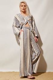 Брюки женские палаццо из льняной ткани в бежево\синюю\голубую полоску с высокой посадкой на талии. Верхний край брюк на резинке. Спереди обработаны боковые наклонные карманы.