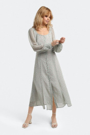 Миди-платье из струящегося текстиля с цветочным дизайном. Детали: прилегающий силуэт, рельефные швы переда и спинки, кареобразный вырез переда, высокие разрезы, застежка на петли и пуговицы, рукава длинные со сборкой и притачными манжетами с застежкой на петли и пуговицы, съемный пояс со шлевками в боковых швах, платье на подкладке Длина по спинке от плечевой точки около 123см, длина рукава около 64 см