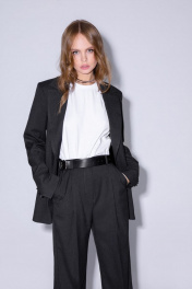 Текстильные прямые брюки-палаццо. Детали: брюки с высокой посадкой на притачном поясе со шлевками, застежка на молнию и пуговицу, боковые карманы, передние половины с заутюженными стрелками и двумя небольшими складками Длина брюк по боковому шву с поясом около 113/114,5 см