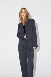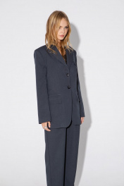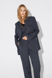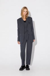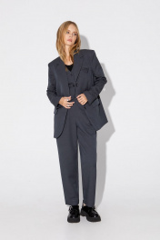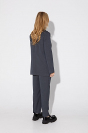 Текстильный костюм-тройка из свободного жакета, укороченного жилета и укороченных брюк с резинкой по поясу. Детали: жакет прямого силуэта, пиджачный воротник, перед с прорезными функциональными карманами, нагрудный декоративный карман, однобортная застежка на петли и пуговицы, спинка со средним швом, рукава втачные двухшовные с разрезами по низу, жакет на подкладке. Жилет прямого силуэта с фигурным низом, талиевые вытачки, застежка на петли и пуговицы, функциональные карманы, на подкладке. Брюки с высокой посадкой, притачной пояс со шлевками, задняя часть пояса эластичная- с резинкой, застежка на молнию и пуговицу, боковые карманы, передние половины с двумя складками. Длина жакета по спинке около 72 см в размерах 40-46 и около 74 см в размерах 48-52, длина рукавов около 62,5 см. Длина жилета по спинке около 39 см в размерах 40-46 и около 43 см в размерах 48-52. Длина брюк по боковому шву с поясом около 99 см в размерах 40-46 и около 100,5 см в размерах 48-52, длина по внутреннему шву около 69,5 см.