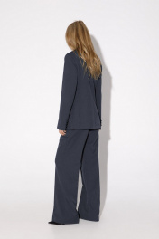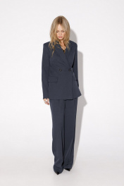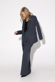 Текстильный комплект-тройка из классического полуприлегающего жакета, базовой трикотажной майки и широких прямых брюк. Детали: жакет полуприлегающего силуэта, талиевые вытачки, пиджачный воротник, застежка на две петли и пуговицы, функциональные карманы, жакет на подкладке. Майка из трикотажа- «лапша», глубокие вырезы горловины и пройм. Брюки с высокой посадкой на притачном поясе со шлевками, застежка на молнию и пуговицу, боковые карманы, передние половины с заутюженными стрелками и двумя небольшими складками. Длина по спинке около 68 в размерах 40-46 и около 71 см в размерах 48-52, длина рукавов около 61 см. Длина майки от плечевого шва около 37 см в размерах 40-46 и около 39 см в размерах 48-52. Длина брюк по боковому шву с поясом около 113 см в размерах 40-46 и около 114,5 см в размерах 48-52, длина по внутреннему шву около 82 см.