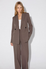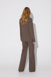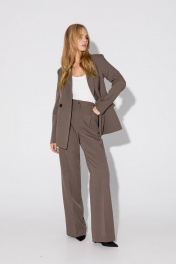 Текстильный комплект-тройка из классического полуприлегающего жакета, базовой трикотажной майки и широких прямых брюк. Детали: жакет полуприлегающего силуэта, талиевые вытачки, пиджачный воротник, застежка на две петли и пуговицы, функциональные карманы, жакет на подкладке. Майка из трикотажа- «лапша», глубокие вырезы горловины и пройм. Брюки с высокой посадкой на притачном поясе со шлевками, застежка на молнию и пуговицу, боковые карманы, передние половины с заутюженными стрелками и двумя небольшими складками. Длина по спинке около 68 в размерах 40-46 и около 71 см в размерах 48-52, длина рукавов около 61 см. Длина майки от плечевого шва около 37 см в размерах 40-46 и около 39 см в размерах 48-52. Длина брюк по боковому шву с поясом около 113 см в размерах 40-46 и около 114,5 см в размерах 48-52, длина по внутреннему шву около 82 см.