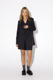 Текстильный костюм-двойка из трапециевидного жакета свободного покроя и высоких шорт. Детали: пиджачный воротник, талиевые вытачки, перед с функциональным нагрудным и двумя прорезными карманами, застежка на пуговицы, спинка со средним швом и высокой шлицей, рукава втачные двухшовные, жакет на подкладке. Шорты с высокой посадкой, застежка на потайную молнию сзади, боковые карманы. Длина жакета по спинке около 73 см в размерах 40-46 и около 75 см в размерах 48-52, длина рукава около 61 см. Длина шорт по боковому шву 47/48,5 см.