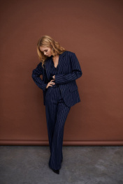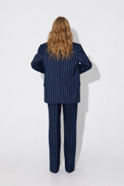 Текстильный костюм-двойка из оверсайз жакета и прямых брюк-палаццо со стрелками. Детали: жакет прямого силуэта, расширенная линия плеч, пиджачный воротник, перед с прорезными функциональными карманами, однобортная застежка на петли и пуговицы, спинка со средним швом и шлицей, рукава втачные двухшовные, жакет на подкладке. Брюки с высокой посадкой на притачном поясе со шлевками, застежка на молнию и пуговицу, боковые карманы, передние половины с заутюженными стрелками и двумя небольшими складками. Длина жакета по спинке около 69 см в размерах 40-46 и около 72 см в размерах 48-52, длина рукавов около 62 см. Длина брюк по боковому шву с поясом около 113 см в размерах 40-46 и около 114,5 см в размерах 48-52, длина по внутреннему шву около 82 см.