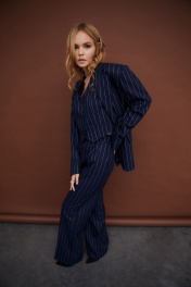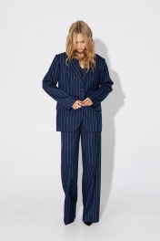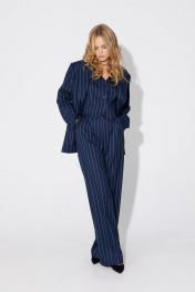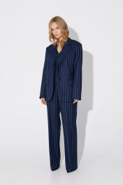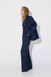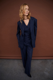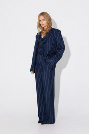 Текстильный костюм-тройка из оверсайз жакета, укороченного жилета и прямых брюк-палаццо со стрелками. Детали: жакет прямого силуэта, расширенная линия плеч, пиджачный воротник, перед с прорезными функциональными карманами, однобортная застежка на петли и пуговицы, спинка со средним швом и шлицей, рукава втачные двухшовные, жакет на подкладке. Жилет прямого силуэта с фигурным низом, талиевые вытачки, застежка на петли и пуговицы, функциональные карманы, на подкладке. Брюки с высокой посадкой на притачном поясе со шлевками, застежка на молнию и пуговицу, боковые карманы, передние половины с заутюженными стрелками и двумя небольшими складками. Длина жакета по спинке около 69 см в размерах 40-46 и около 72 см в размерах 48-52, длина рукавов около 62 см. Длина жилета по спинке около 39 см в размерах 40-46 и около 43 см в размерах 48-52. Длина брюк по боковому шву с поясом около 113 см в размерах 40-46 и около 114,5 см в размерах 48-52, длина по внутреннему шву около 82 см.