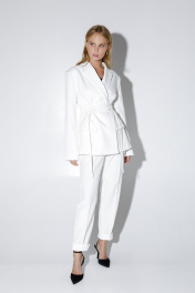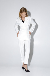 Текстильный костюм-двойка из жакета со шнуровкой с расширенной линией плеч и классических укороченный брюк со стрелками. Детали: жакет полуприлегающего силуэта, рельефы, пиджачный воротник, застежка на две петли и пуговицы, функциональные карманы, жакет на подкладке. Жакет также можно зашнуровать по бокам. Брюки на притачном поясе со шлевками, застежка на молнию и пуговицу, боковые карманы, передние половины заутюженными стрелками. Задние части брюк с вытачками, стрелками и имитацией карманов. Низ брюк с широкой подгибкой, при помощи подгибки можно регулировать длину, подвернув её. Длина по спинке около 68,5 в размерах 40-46 и около 71,5 см в размерах 48-52, длина рукавов около 63 см. Длина брюк по боковому шву с поясом около 101,5 см, длина по внутреннему шву около 74 см