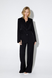 Текстильный костюм-двойка из приталенного жакета свободного покроя с разрезами по рукавам и прямых брюк-палаццо со стрелками. Детали: жакет прилегающего силуэта, пиджачный воротник, рельефные швы, перед с прорезными карманами, застежка на петли и пуговицы, спинка со средним швом, рукава втачные двухшовные с высоким разрезом по низу рукавов, жакет на подкладке. Брюки с высокой посадкой на притачном поясе со шлевками, пояс прямой без резинки, застежка на молнию и пуговицу, боковые карманы, передние половины с заутюженными стрелками и двумя небольшими складками. Задние части брюк с вытачками и заутюженными стрелками. Длина жакета по спинке около 64 см в размерах 40-46 и около 67 см в размерах 48-50, длина рукавов около 64 см. Длина брюк по боковому шву с поясом около 113 см в размерах 40-46 и около 114,5 см в размерах 48-52, длина по внутреннему шву около 82 см.