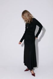 Трикотажное асимметричное платье длины макси с V-образным вырезом спинки. Детали: прилегающий силуэт, фигурный вырез горловины спинки, воротник- стойка с застежкой на петли и пуговицы, рукава втачные удлиненные, сборка по бокам ниже талии. Длина по спинке около 140 см, длина рукава около 63 см