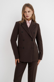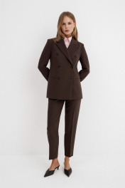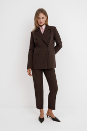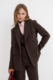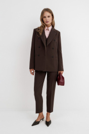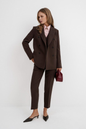 Текстильный костюм-тройка из двубортного жакета, полуприлегающего жилета и укороченных брюк со средней посадкой. Детали: жакет прямого силуэта, пиджачный воротник, перед с прорезными карманами, застежка на петли и пуговицы, спинка со средним швом, рукава втачные двухшовные, жакет на подкладке. Жилет полуприлегающего силуэта с фигурным низом, застежка на петли и пуговицы, на подкладке. Брюки на притачном поясе со шлевками, передние половины с небольшими мягкими складками и заутюженными стрелками, застежка на молнию и пуговицу, боковые карманы. Длина жакета по спинке около 66 см в размерах 40-46 и около 69 см в размерах 48-52, длина рукава около 61 см. Длина жилета по спинке около 48,5 см в размерах 40-46 и около 51,5 см в размерах 48-52. Длина брюк по боковому шву с поясом около 93,5 см в размерах 40-46 и около 95 см в размерах 48-52. Длина по внутреннему шву около 66 см.
