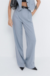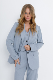 Текстильный костюм-двойка из свободного жакета со шлицами и прямых брюк-палаццо со стрелками. Детали: жакет полуприлегающего силуэта, талиевые вытачки, пиджачный воротник, застежка на две петли и пуговицы, функциональные карманы, рукава и спинка со шлицами, жакет на подкладке. Брюки с высокой посадкой на притачном поясе со шлевками, застежка на молнию и пуговицу, боковые карманы, передние половины с заутюженными стрелками и двумя небольшими складками. Пояс брюк прямой, без резинки. Длина жакета по спинке около 70 см в размерах 40-46 и около 73 см в размерах 48-52, длина рукавов около 63 см. Длина брюк по боковому шву с поясом около 113 см в размерах 40-46 и около 114,5 см в размерах 48-52, длина по внутреннему шву около 82 см.