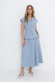 Текстильный костюм-двойка из приталенного жилета с воротником-стойкой и миди-юбки со складками. Детали: жилет полуприлегающего силуэта, цельнокроеный воротник-стойка, рельефные швы переда и спинки, функциональные карманы, застежка на петли и пуговицы, жилет на подкладке. Юбка на притачном поясе со шлевками, прорезные карманы, застежка на потайную молнию в левом боковом шве, юбка на подкладке. Длина жилета по спинке около 54 см в размерах 40-46 и около 56 см в размерах 48-52. Длина юбки по боковому шву с поясом около 80 см.