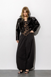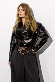 Укороченная куртка-бомбер из лакированной экокожи. Детали: прямой силуэт, воротник, пояс переда и спинки на резинке, застежка на кнопки, рукава длинные с высокими обтачками по низу, функциональные карманы, спинка со средним швом, куртка на подкладке. Длина по спинке с поясом около 46 см в размерах 40-46 и около 50 см в размерах 48-52, длина рукава около 57 см+ расширенное плечо